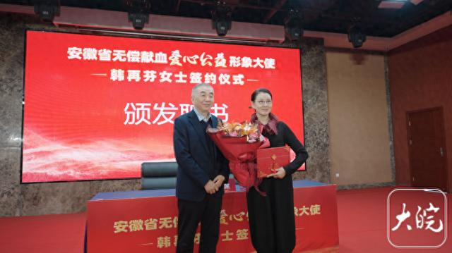 仪式现场气氛热烈,安徽省卫生健康委党组书记刘同柱向韩再芬颁发”安徽省无偿献血爱心公益形象大使”聘书。
